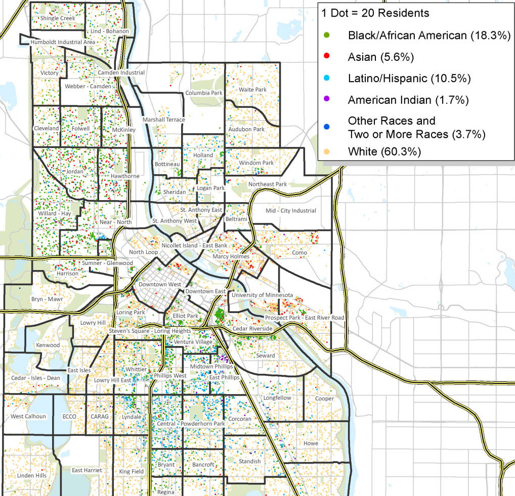 The first thing to note is that Minneapolis is a pretty diverse city - around sixty percent white, forty percent ethnic minority. It is certainly more diverse than Minnesota as a whole which is about 75% white (7% black, 6% Latino, 6% mixed and 5% Asian), which is somewhat similar to the racial diversity of England, albeit with differently sized ethnic minority groups.