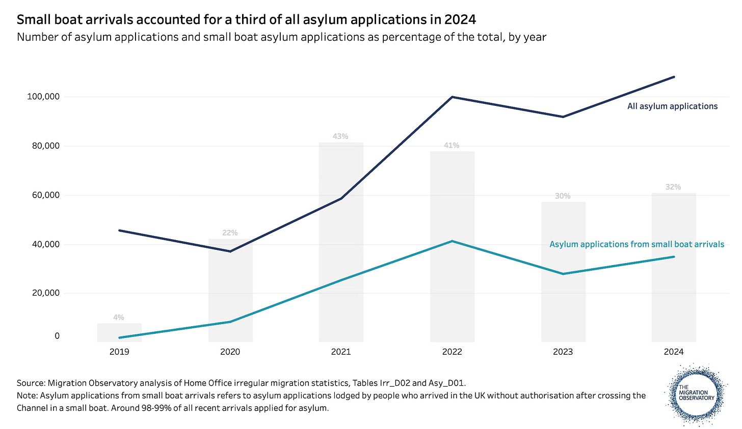 Indeed, although small boat arrivals are the most noticeable and salient way asylum seekers arrive (and about 95% of small boat arrivals claim asylum), it is actually a minority of all annual asylum claims even today. This useful figure from the Oxford Migration Observatory shows that they constitute just one one third of the over 100,000 asylum applications.