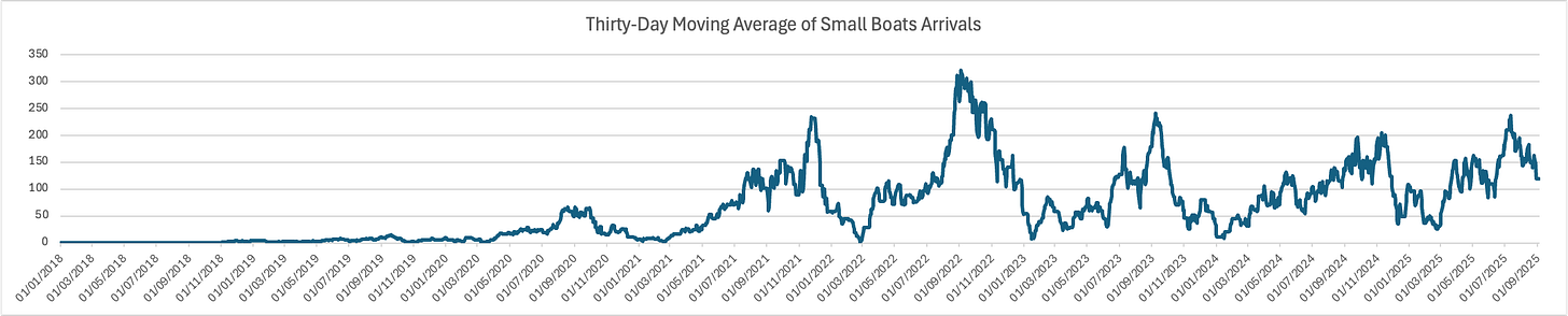 Bluntly, it doesn’t look like either approach has really worked. Here is a graph showing the thirty-day average of migrants arriving by small boats back to 2018. Look at my Excel graphing powers and tremble…