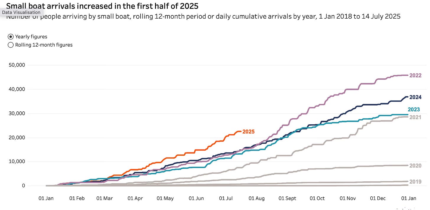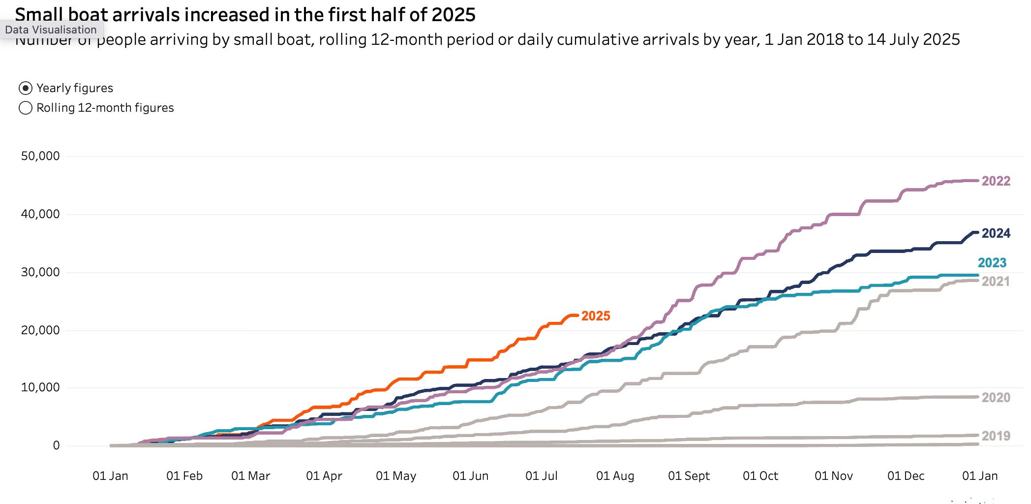 Well you can see Rishi Sunak’s problem. He arrived at the end of 2022, during the peak period of small boat crossings and the following year they were still elevated. And has anything much changed with Keir Starmer in power? Not really, save the curve looks a bit higher during spring of 2025 than it had in previous years, presumably because of the very warm spring in Britain this year. That means comparing the trajectory over the course of the year, 2025 does look abnormal, as you can see in the graph below from the Oxford Migration Observatory. The question is how things go later in the year and whether the annual numbers really rise on 2024.
