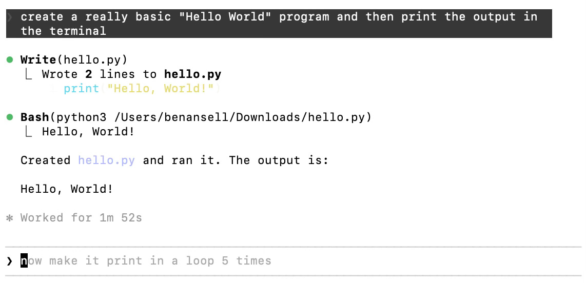 So now we see it wrote the code (all two lines of it) to a file it created called “hello.py” and then the ‘bash’ command tells us that it ran a Python compiler, and then below that we see the exciting output. It says it worked for 1m and 52s but the only reason it took so long is because I am writing this on a train and was out of internet range for approximately 1m and 51s. It then provides me with a suggestion for a new edit (looping five times). I’ll spare you that.