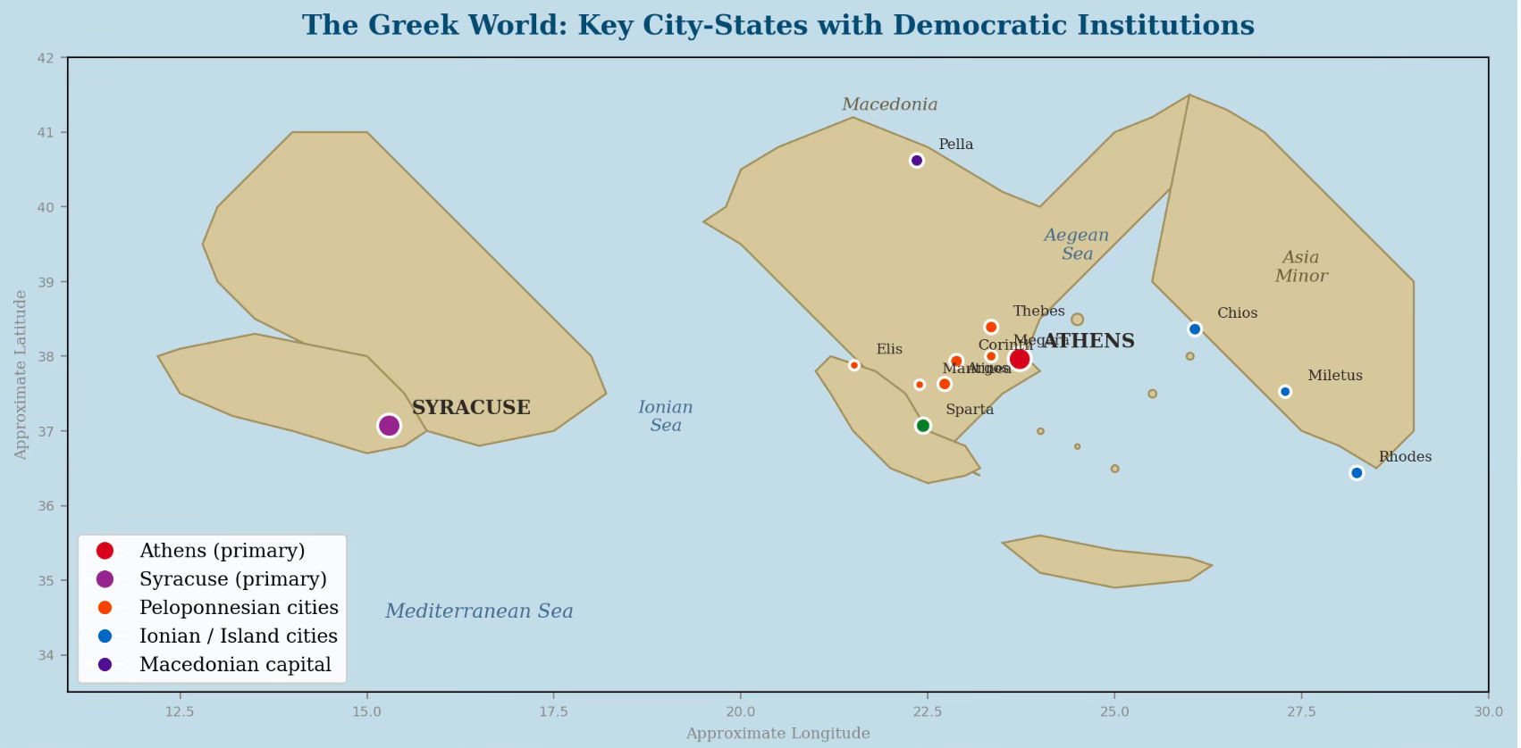 So, this is kind of cool. We get a bunch of the things I asked for (e.g. discussion of sortition and ostracism, a focus on Athens and Syracuse). But there are some weaknesses. It’s all quite thinly sourced - there are sources given down the bottom but it’s hard to tell where any particular information came from. It feels like a textbook written maybe for first year university students but there is of course no real instructor - there is an AI grabbing stuff that seems related and presenting it nicely. Oh and I forgot to tell you, the first map it produced was hilariously wrong and ugly. I mean look at this: