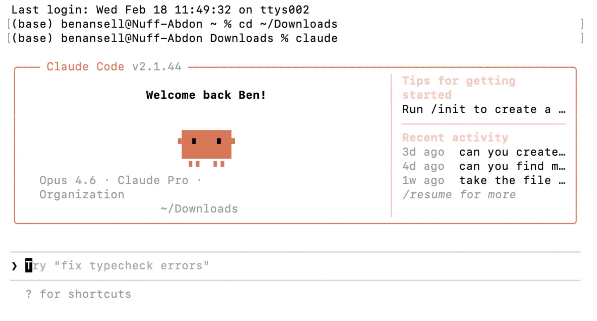 I’ve done two things here. The first is to type “cd ~/Downloads”. “cd” means change directory. Why am I telling you this? Because a crucial thing about Claude Code is it needs your permission to access a working directory. This is to stop it going places on your computer that it shouldn’t and potentially wrecking havoc. So I am putting it in my Downloads folder, which is where it will look for files, create files and folders and potentially delete them. And I had to previously give it permission to do that (it doesn’t ask every time if you’ve done so beforehand).