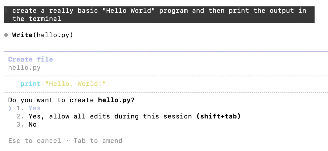 Here’s my request, in the black outline above. Below that is Claude Code’s response. OK, here’s what I will create - a file in Python called “hello.py”. Importantly, it also asks me if I want to actually do that, by pressing 1, 2, or 3. This permission structure is really important - it stops Claude Code from going off and just creating (or more worryingly, deleting) things without your say so. Of course if I pressed 2 I would give it permission not only for this but for related edits and while that’s usually fine it very much depends on the context.