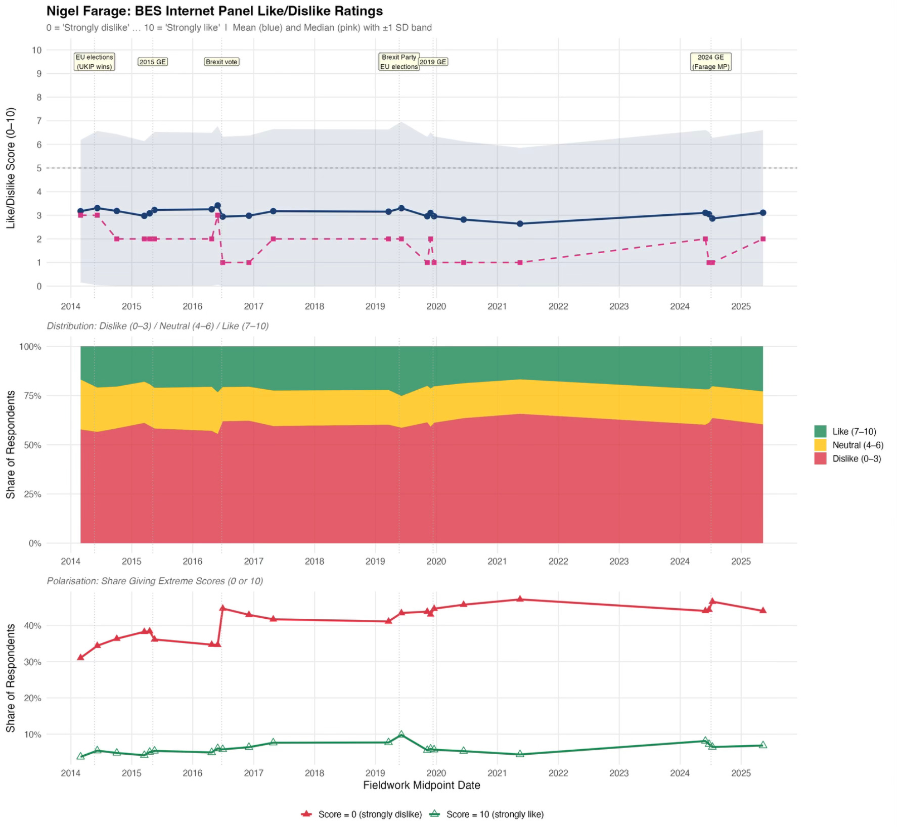 But I knew where the data was. The British Election Study has asked questions about people’s relative liking of Nigel Farage all the way back to 2014. So here I did some work and Claude did other bits. I downloaded the giant thirty wave BES panel. I selected the necessary questions from it. I gave Claude some information about when each wave was. And then I asked it to do the grunt-work of showing me how this has changed over time.