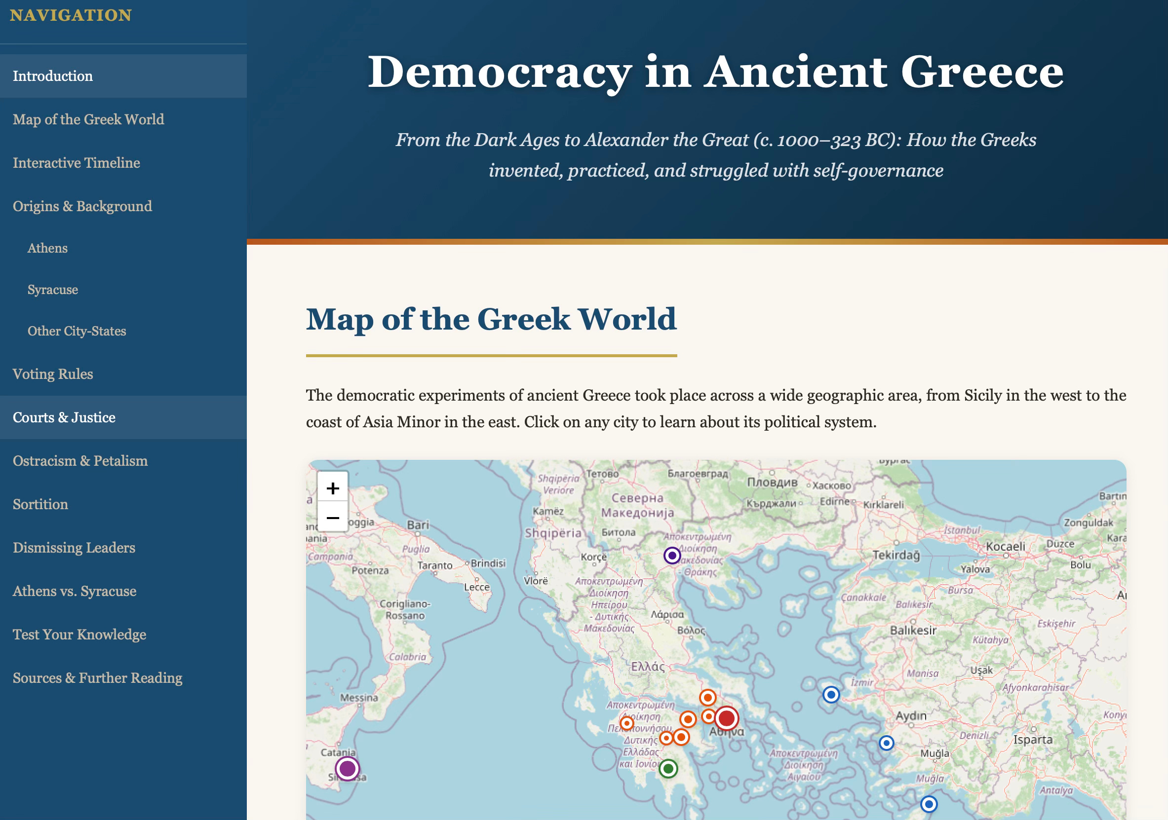 We move on! This time to something more educational. I’m currently writing a ‘natural history’ of democracy (due to be finished next year). So I thought, I wonder if Claude can come up with a nice interactive website on Ancient Greek democracy. Here’s the prompt: