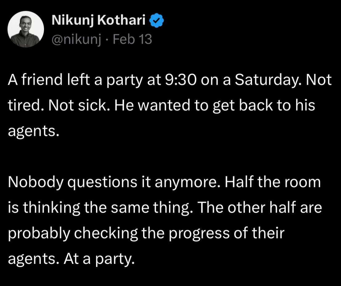People in the Valley can’t stop agenting. The only limitation in an endless factory of agents doing stuff for you is tokens - the price of using an agent. If you had unlimited tokens then I guess you could have unlimited agents doing unlimited stuff.
