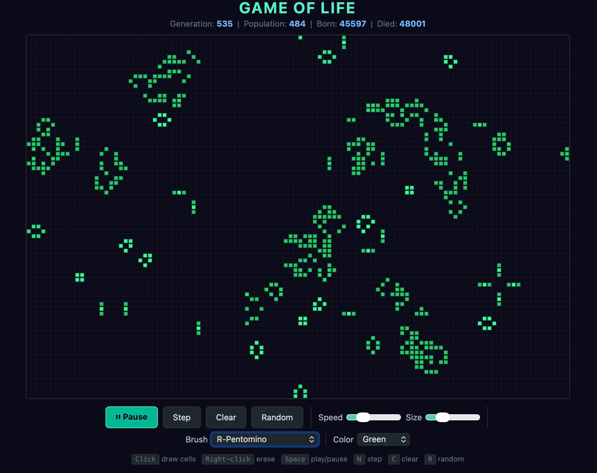 Simple rules, simple presentation. Sounds like an algorithm that would be easy for Claude Code to produce. And indeed all I had to do was ask it to do that “can you create me a small video game that is based around conway’s game of life”. And it created me this entire website.